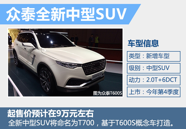 众泰T600去年的销量占到公司总销量的50%以上,未来,众泰汽车还将在快速增长的SUV市场布局更多新产品。全新中型SUV T700基于T600S概念车打造,在市场定位以及车身尺寸方面都要高于T600。新车将在今年第4季度正式上市,起售价预计在9万元左右,推出后会成为独立车系并主攻更高端的细分市场。