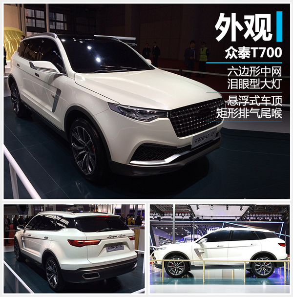 众泰T700在外观方面融入了轿跑元素,相比T600更加偏向运动风格。六边形中网内嵌有网格状进气格栅,大尺寸下进气格栅融入中式古建筑元素,前大灯与后尾灯均采用细长条泪眼型设计。经过黑色处理的D柱衬托出悬浮式车顶。内凹的车门勾勒出上下两条平行的腰线。此外,新车还采用了众泰汽车最新的英文标识,分别位于前进气格栅和后尾门的中央位置。