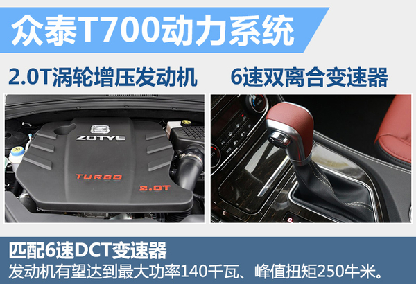 目前,众泰T600提供两种不同动力的车型,分别搭载1.5T、2.0T涡轮增压发动机。全新中型SUV T700有望继续采用2.0T涡轮增压发动机,这台型号为4G63S4T的发动机拥有最大功率140千瓦、峰值扭矩250牛米的动力输出。传动系统方面,与发动机匹配的有望是6速DCT双离合变速箱。
