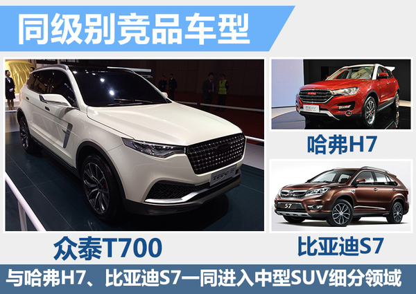 目前在国内自主品牌中型SUV领域,长城汽车旗下的哈弗H7将在4月25日开幕的北京车展正式上市。哈弗H7定位中型SUV领域,同期上市的还有7座版车型。此外,同样采用7座布局的还有比亚迪汽车旗下的中型SUV S7。众泰T700推出后,将与上述两款车型进入同一细分领域,展开竞争。(网通社 2016年4月5日 北京报道)