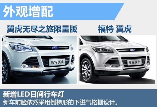 福特2016年前两个月在华累计销量达到194,182辆,较去年同期增长18%。SUV车型有着出色的销量表现,翼搏、翼虎、锐界、探险者及撼路者车型1月总销量达到37,411辆,较2015年1月增长75%。在此基础上,福特将进一步加强在SUV领域的竞争力。网通社从福特官方获悉,新款翼虎—无尽之旅限量版车型已经正式上市。新车价格方面没有变化,配置大幅提升,增加了LED日间行车灯等6项配置。