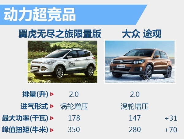 紧凑型SUV今年1-2月在华累计销量为73.05万辆,同比增幅高达67%,在SUV市场中占比达到57.5%,较去年同期提升4个百分点,份额进一步扩大。在紧凑级SUV市场,福特翼虎有众多竞争对手。无尽之旅限量版上市后将继续与大众途观、本田CR-V等展开竞争。其中大众途观和新款翼虎都搭载2.0T发动机,通过对比可以看出新款翼虎动力占据优势。(网通社2016年4月5日北京报道)