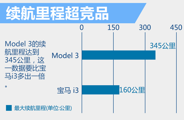 续航能力是衡量纯电动车的重要标准之一。Model 3将在位于美国加州菲蒙市(Fremont)的特斯拉工厂投产,而电池组将由特斯拉Giga工厂进行生产,经过优化升级,特斯拉Model 3的续航里程将超过345公里,相比宝马i3而言,续航里程多出一倍。新车百公里加速将在6秒以下。同时,特斯拉Model 3还拥有单电机后轮驱动,以及双电机四轮驱动的选择。