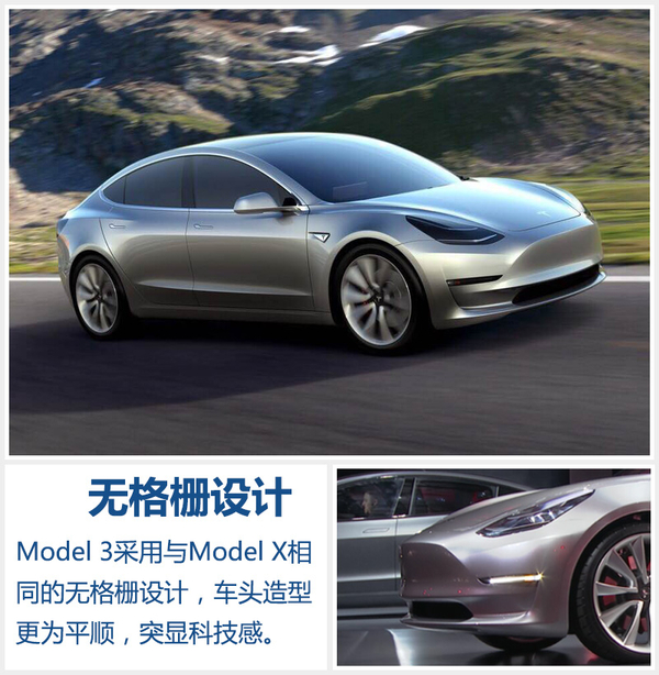 Model 3沿用了Model S和Model X的设计理念,整体车身轮廓采用更多流线形设计,与现阶段各大传统换代车型的“犀利”设计形成鲜明对比。新车前脸部分并没有采用与Model S相同的伪格栅造型,而是与Model X相似的平顺曲面设计。在车头部分隐藏了前置摄像头、雷达以及360度超声波传感器等设备,能够探测车身周围约5米范围内的障碍物,在开阔路面和频繁停车起步的路况可实现自动驾驶,还拥有OTA空中升级、远程诊断、以及APP联接等功能。前灯组分割为三部分,底部采用黑色。