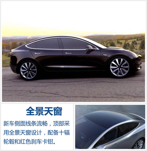 车身侧面造型流畅,一条弧线从前挡风玻璃一直延续至尾翼处,这样的设计有助于进一步降低风阻,在一定程度上提升动力性能,同时车顶采用黑色全景天窗设计。新车配备镀铬十辐轮毂,前车轮配有红色刹车卡钳,使整车更具运动型。Model 3延续Model S感应式门把手设计,车主携带钥匙靠近车身时把手会自动弹出。行驶时车门把手会自动缩回,使车身侧面平滑一体,进一步降低空气阻力。