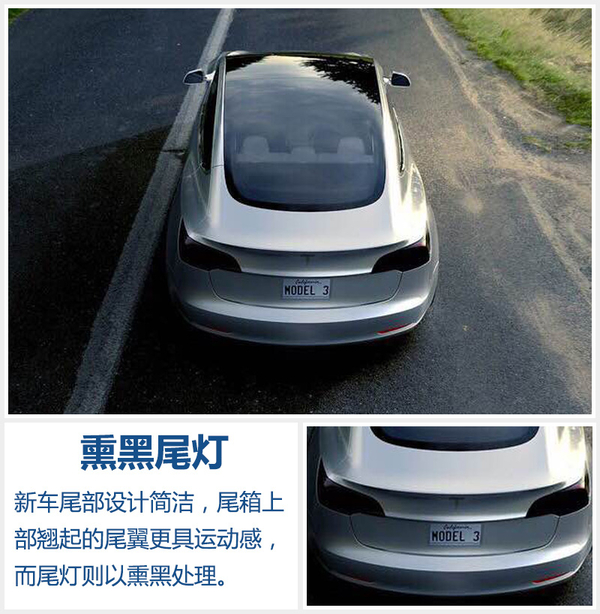 新车尾部造型简洁,包括尾箱上方和中部均采用凸起设计,更具立体感和时尚感。新车尾灯采用熏黑处理,尾部下方两侧配备后雾灯,保证行车安全。与Model S一样,Model 3也拥有实用的前、后双行李箱的设计,让消费者拥有更多的储物空间。Model 3还配备了全新的15寸触摸屏,整合信息显示及车辆控制等功能。(网通社 2016年4月5日 北京报道)