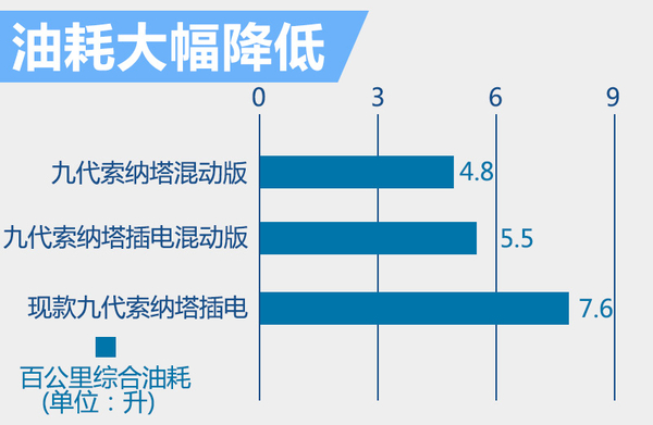 第九代索纳塔混动版和插电混动版在传统动力系统上均搭载2.0升自然吸气发动机,由于混合动力驱动形式不同,油耗方面也有所差异,索纳塔混动版与插电式混动版的百公里综合油耗分别为4.8升和5.5升,相比现款第九代索纳塔2.0升版7.6升/100公里的油耗,分别大幅降低了37%和28%,这项数据对一台B级轿车来说是非常可观的。