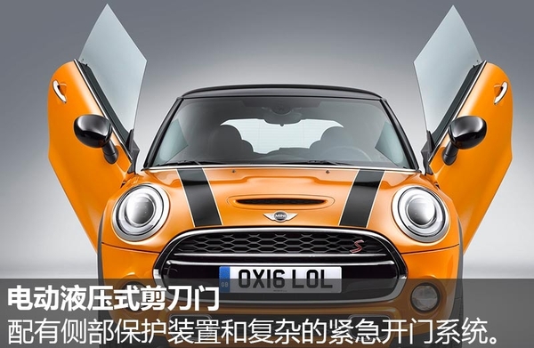 MINI推出的剪刀门设计使用了电动液压式剪刀门,采用了侧部保护装置和十分复杂的紧急开门系统,其中紧急开门系统可在发生事故后自动将门炸开,方便救援人员对车内驾驶员和乘客进行施救。消费者可直接按压车门上的开门按钮或使用车钥匙远程打开车门,未来还可通过智能手机上的MINI Excitement App来遥控打开车门。