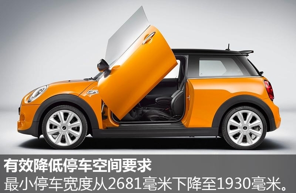 MINI车型使用剪刀门设计后,能够有效降低停车时对停车空间的要求:最小的停车宽度从2681毫米下降至1930毫米,大幅降低了约30%,极大地方便了消费者的出行。在空间较为局促的停车场内,配有剪刀门设计的MINI车型方便乘客上下车,同时能有效避免与其他车辆的刮擦。