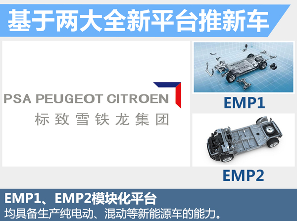 标致雪铁龙集团旗下EMP1平台,是一个以固定前轴以及发动机布局和位置为基础的模块化平台。在此基础上,动力系统、悬架、车辆的前后段等模块通过标准化的组件和一致性的模块接口,在更大的范围内实现了零部件的共享,有效地控制研发和生产的成本。同时,集团旗下的EMP2模块化平台在车型级别、车身尺寸、车身配置、动力总成等方面,都可以根据不同的需求进行调整,生产车型的轴距最长可达到2,900毫米。另外,根据官方公布的消息,除了采用传统内燃机动力系统的车型,EMP1与EMP2两大模块化平台均具备生产纯电动、混动等新能源车的能力。