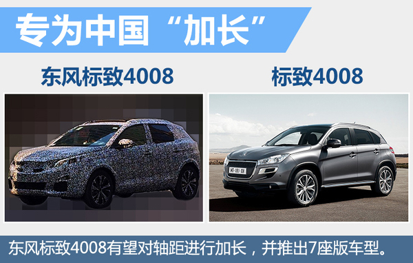 目前在售的进口标致4008,车身长、宽、高分别达到4,340*1,800*1,626毫米,轴距为2,670毫米。东风标致全新4008基于PSA集团旗下的EMP2平台打造,这一模块化平台在车型级别、车身尺寸、车身配置、动力总成等方面,都可以根据不同的需求进行调整,生产车型的轴距最长可达到2,900毫米。新车在进口4008的基础上,有望对轴距、车身进行加长,并采用7座布局。