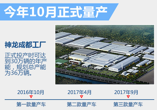 关于未来的新车规划,神龙成都工厂厂长芦从国此前向网通社表示:“今年10月第一款车量产后,2017年4月将会量产第二款车,9月是第三款车。”神龙第4工厂规划总产能为36万辆,到今年10月东风标致全新4008正式投产之时,将达到30万辆的年产能。此外,神龙公司总经理邱现东补充道:“2016到2020年,神龙将每年至少有一款新车型投放市场。”十三五期间,神龙汽车将力争实现年产销150万辆的目标。(网通社 2016年4月6日 北京报道)