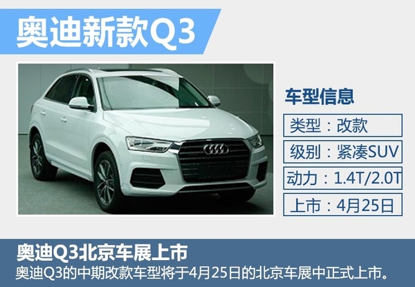 奥迪新款Q3在去年的北美车展中正式发布,新车采用全新的家族化设计,其国产车型将在今年引入国内。一汽-大众奥迪内部人士向网通社表示:奥迪Q3的中期改款车型将于4月25日的北京车展中正式上市。新车的整车尺寸相比现款车型有所增长,外观设计更加家族化,动力方面提供1.4T和2.0T高、低功率版两种排量发动机,驱动方式配有前驱和四驱两种形式选择。