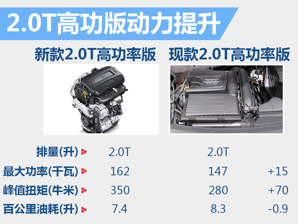 动力部分,新款Q3将继续搭载1.4T和2.0T两种排量发动机,其中1.4T发动机最大功率为110千瓦;2.0T则分为高、低功率两种不同版本,高功率2.0T发动机车型为全时全轮驱动,最大功率为162千瓦,峰值扭矩达到350牛米。;而低功率2.0T车型将推出前驱、全时全轮驱动两种车型,最大功率为132千瓦,峰值扭矩为320牛米。2.0T的高、低功率版较现款Q2动力均有所提升,油耗也明显下降。