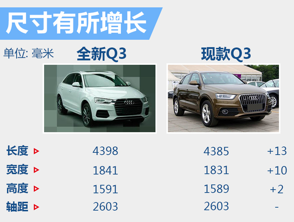 奥迪新Q3在车身尺寸方面较现款也有所增加,车身尺寸为4398*1841*1591毫米,轴距为2603毫米。与现款相比,长宽高分别增加13、10和2毫米,轴距与现款保持一致。相信精致的外形设计,得到提高的车辆大小及动力,下降的油耗,都能为全新奥迪Q3在豪华紧凑型SUV领域带来不小的竞争力。