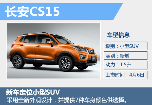 在长安汽车现有产品体系中,以“CS”命名的SUV产品,目前已有CS35、CS75两款车型。根据长安汽车规划:未来将逐步完善“CS”产品序列,覆盖由小型到大型各个细分市场。今年年初,全新入门SUV——CS15已经在合肥工厂下线。网通社从长安汽车官方获悉:CS15将于今日在北京正式发布上市。新车先期将推出搭载小排量的1.5升自然吸气发动机的4款车型,预计6万元起售。