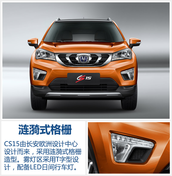 CS15由长安欧洲设计中心设计,摆脱了现款CS75、CS35标志性的“脸谱”设计,大胆应用全新发散涟漪式格栅造型,开启了长安SUV车系新家族元素应用新阶段。这一设计元素还将应用长安全新旗舰SUV CS95上。新车雾灯区采用T字型镀铬条勾勒轮廓,并配备条形LED日间行车灯。车头下沿的银色护板增添“野性”的同时也非常实用。