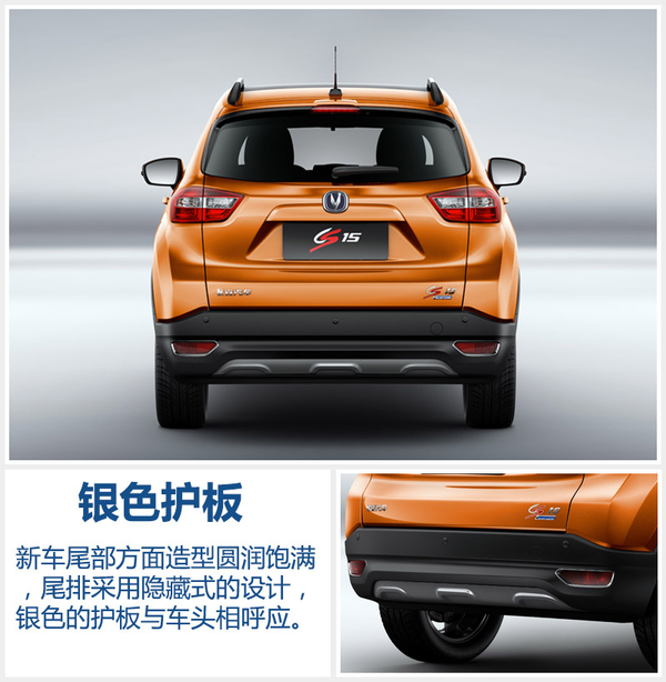新车侧身线条简洁,配备16寸双色五辐铝合金轮毂,搭配亮红色卡钳为这款小型SUV增添了运动化元素。CS15侧裙采用镀铬饰条装饰,车顶配备行李架,在增强实用性功能的同时也为整体视觉效果添彩。尾部造型圆润饱满,尾排采用隐藏式设计,银色的护板与车头相呼应。新车提供了7种车身颜色供消费者选择。