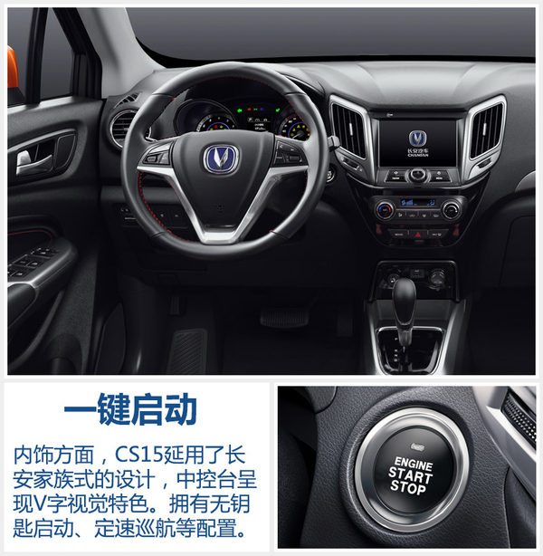 内饰方面,CS15延用了长安家族式的设计,中控台呈现V字视觉特色,配有7英寸触控显示屏。全景天窗是一大亮点,此外新车还配备发动机自动启停、无钥匙启动、以及定速巡航等配置。CS15搭载了in Call智能车载互联系统。这一系统配备高德导航、生活服务、WIFI通道、一键救援等功能,并支持百度Carlife互联系统。