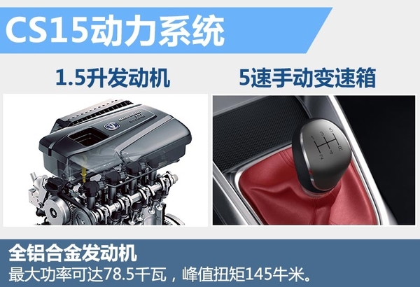 长安CS15配备BlueCore 1.5升全铝合金发动机,属长安EA高效能发动机系列,应用DOHC顶置双凸轮轴和DVVT(双可变气门正时)技术,强调动力与能耗的平衡性,此前曾搭载在悦翔V5车型上。这台发动机最大功率可达78.5千瓦,峰值扭矩145牛米。与发动机匹配的是一台5速手动变速箱。