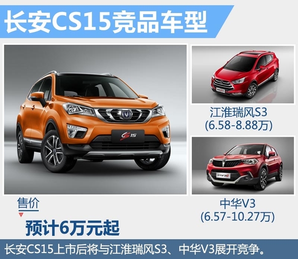 在小型SUV市场,CS15并不缺竞争对手。江淮瑞风S3和中华V3这两款车在今年2月份销量均超1.5万辆。CS15上市后,将于上述两款车型展开竞争。从售价上来看,江淮瑞风S3的价格区间为6.58-8.88万元,中华V3的价格区间为6.57-10.27万元,长安CS15在售价方面有望占有优势。(网通社 2016年4月6日 北京报道)