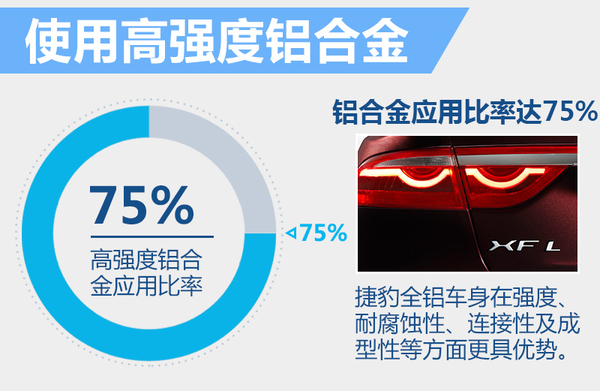 奇瑞捷豹路虎全铝车身车间占地面积48,384平方米,拥有335台机器人,其中自冲铆接机器人232套,自动化率达100%。根据官方公布的信息,全新捷豹XF长轴距版的车身铝合金应用比率达75%,使用了型号为为RC5754的高强度铝合金,相比传统车身材料,捷豹全铝车身在强度、耐腐蚀性、连接性及成型性等方面更具优势,同时重量也将大幅降低。全新捷豹XF长轴距版车身重量仅为297千克,有利于提升燃油经济性和操控表现。