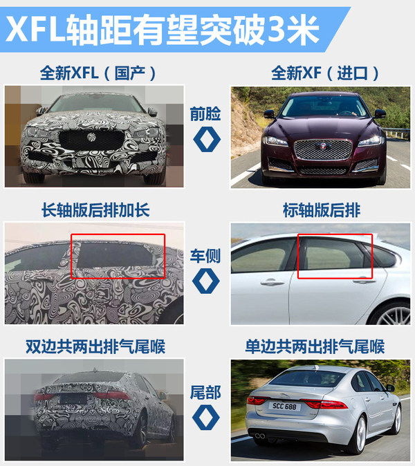 新车相比目前在售的进口XF最大的变化就是,XFL后车窗横向尺寸有所增加,这也是国产长轴距版最明显的特征。全新XF较上一代车型在轴距上增加了51毫米,达到2,960毫米,而国产的XFL轴距将进一步加长,有望突破3,000毫米。