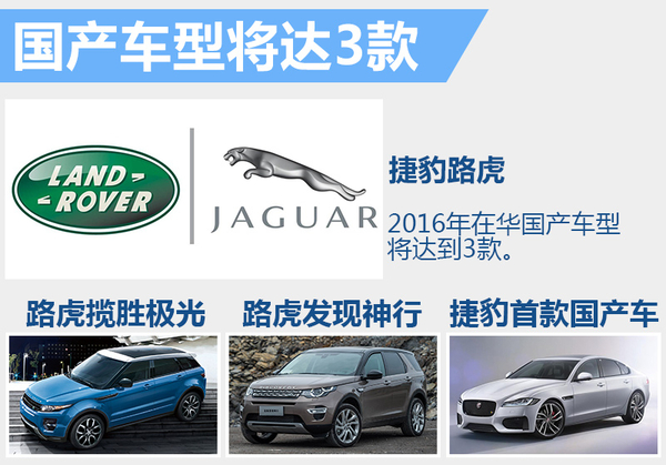 捷豹路虎率先将路虎品牌旗下的揽胜极光和发现神行,进行了在华本土化生产。官方提供的数据显示,在路虎品牌2016年前2月的销量中,国产车型已占据近一半份额,在华业务模式由销售以进口为主向进口与国产双线并行的过渡正在加快。第一款国产的捷豹车型在今年正式投入市场,将使得国产车占比进一步提升,对于今年捷豹路虎在华整体表现起到重要作用。(网通社2016年4月7日常熟报道)