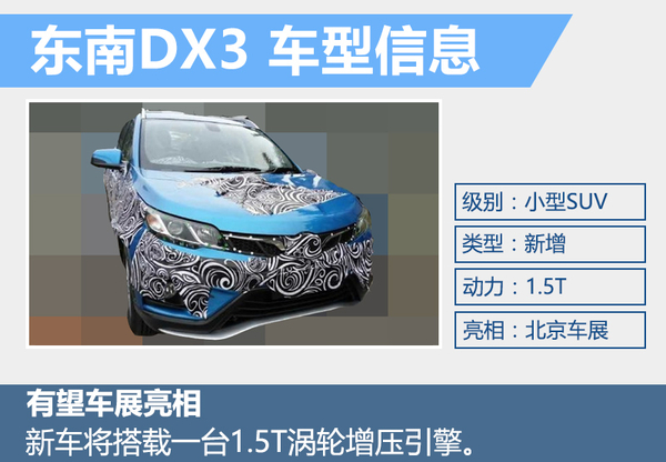 东南在去年推出了全新紧凑型SUV——东南DX7,这款车的推出标志着东南正式进入SUV细分领域,DX7上市后也进一步带动东南整体销量的提升,东南汽车2015年销量为76,185辆,整体同比增长15%。在今年,东南还将推出更多SUV产品。网通社获得了一组东南DX3的车型谍照,新车搭载一台1.5T涡轮增压引擎,并有望在北京车展正式亮相。