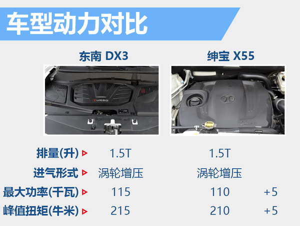 在同级别车型中,绅宝X55搭载了一台1.5升涡轮增压发动,最大功率为110千瓦,峰值扭矩210牛米。东南DX3同样将搭载了一台1.5升涡轮增压发动机,最大功率为115千瓦,峰值扭矩215牛米。相比现款X55所搭载的发动机,DX3功率增加了5千瓦,扭矩增加5牛米,新车在动力上实现小幅提升。