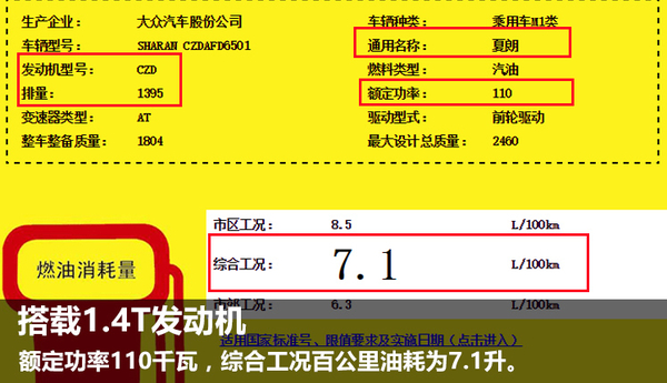 从工信部公示的燃料消耗标识来看,大众夏朗采用代号为CZD的1.4T涡轮增压发动机,传动系统方面,与1.4T增压发动机匹配的是6速DSG双离合变速箱,百公里油耗为7.1升。此外,相比现款车型使用的1.8T和2.0T两款发动机,新车搭载1.4T引擎后消费税上降低2%,以目前现款夏朗2.0T标配型的厂商指导价30.26万为例,根据现行税率计算方法,排量调整后,新车售价将有望降低6,000元左右。此外,在使用1.4T发动机后,车辆还可以享受1.6升购置税减半的优惠政策,车辆最终售价还将进一步下探。