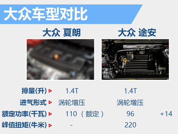 在自家品牌车型中大众途安所使用的1.4升涡轮增压发动机最大功率为96千瓦。大众夏朗搭载的1.4升涡轮增压发动额定输出功率为110千瓦,相比现款途安所搭载的发动机,功率增加了14千瓦,在动力上实现小幅超越。