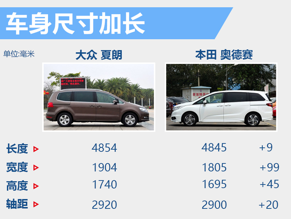 本田奥德赛现款车型车身尺寸为4845*1805*1695毫米,轴距长度为2900毫米,内部乘坐空间较为出色。大众夏朗现款车型车身尺寸为4854*1904*1740毫米,轴距长度为2920毫米。相比同级别车型奥德赛车身长宽高分别多出9毫米、99毫米和45毫米,轴距长出20毫米。大众夏朗内部乘坐空间将更为宽敞,在同级别车型中的竞争力更强。(网通社2016年4月11日北京报道)