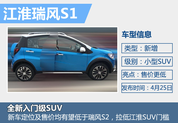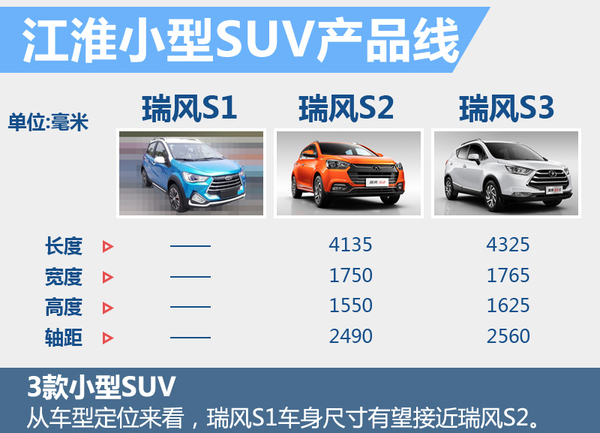 在江淮小型SUV产品矩阵中,目前共有2款车型,分别是瑞风S2和瑞风S3,售价区间分别为5.88-7.58万元、6.58-8.88万元,其中瑞风S3市场表现相对抢眼,2015年月均销量超过1.6万台,今年前2月月均销量超过2万台,成为自主品牌小型SUV细分市场的佼佼者。瑞风S2自去年8月份上市后,今年前2月月均销量也已超过6000台。瑞风S1上市后,将使得江淮小型SUV系列更加具有竞争力。