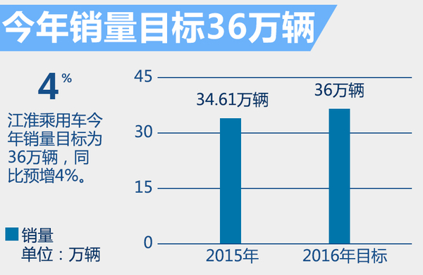 江淮2016年销量目标定为60万辆,包括乘用车、商用车及新能源产品,其中乘用车销量目标为36万辆。在新产品方面,除瑞风S1之外,今年第二季度,江淮旗下全新小型纯电动SUV——IEV6S以及2015广州车展亮相的全新B级轿车瑞风A60将正式上市。下半年,全新SUV瑞风S7将也将推出。据江淮汽车高层介绍:“借助全新SUV的布局,江淮将继续巩固自身在这一市场的地位。“此外,已多次亮相的MPV车型——瑞风M6以及规划中的全新微型电动车,也有望于年内正式上市。在现有产品线基础上,这些新车型都将对江淮今年完成36万辆目标起到重要作用。(网通社2016年4月11日北京报道)