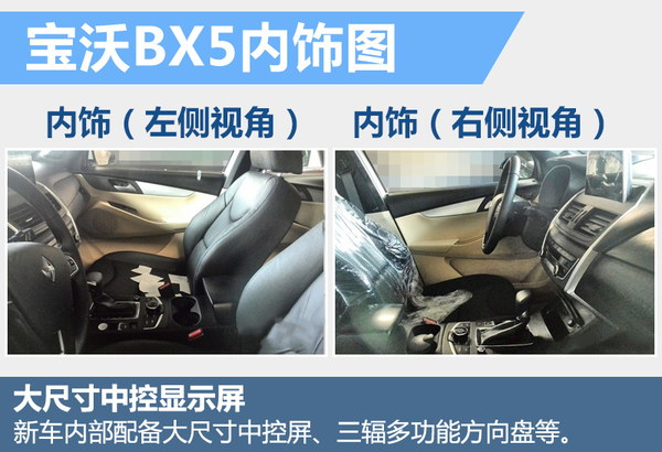 BX5中控台及座椅采用了黑色为主色调,门板为黑米搭配的双色配色。同时,新车车中控台造型层次感较强,顶部配备有独立式的多媒体显示屏。配置方面,宝沃BX5配备了B-Link全知觉人机交互系统、车载4G LTG网络、三辐式多功能方向盘、手机远程车辆信息读取等功能。