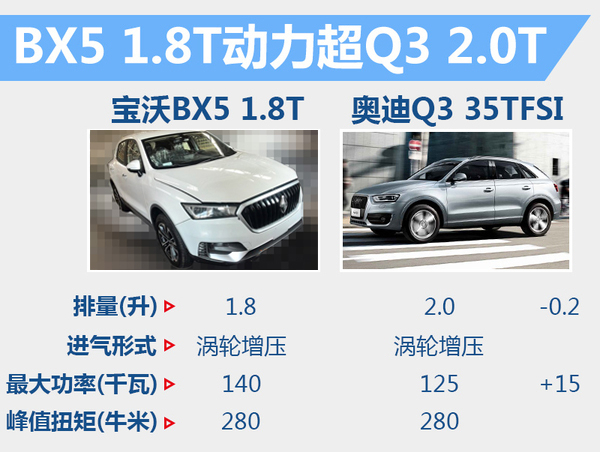 目前在国内豪华紧凑型SUV领域,全新奥迪Q3提供两种不同动力的车型选择。其中,奥迪Q3 35TFSI搭载一台2.0T涡轮增压发动机,最大功率125千瓦、峰值扭矩280牛米。与之相比,排量更小的BX5不仅在峰值扭矩这项参数上与对手持平,而且在最大功率方面比奥迪Q3高15千瓦。