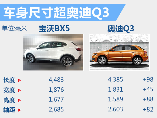 德国宝沃BX5定位紧凑型SUV领域,根据官方公布的数据,车身尺寸长、宽、高分别为4,483*1,876*1,677毫米,轴距达到2,685毫米。而奥迪Q3整车长宽高分别为4,385*1,831*1,589毫米,轴距2,603毫米。通过对比可以发现,宝沃BX5在尺寸全面占据全面优势。(网通社2016年4月11日北京报道)
