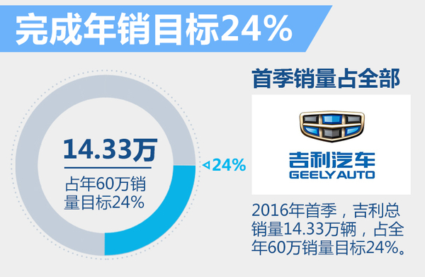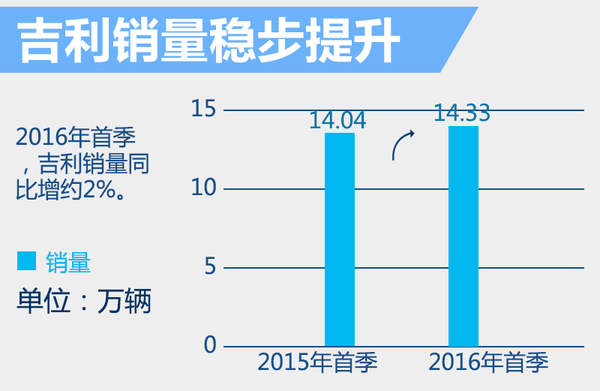 进入2016年后,吉利汽车先后推出了多款年度改款车型,并在上月底正式发布全新紧凑型SUV——博越,密集的投放节奏使得吉利在市场端延续了2015年的良好表现。近日,网通社从吉利汽车官方获悉,2016年首季总销量为14.33万辆,较去年同期增长约2%。按照计划,到今年年底前,吉利还将推出至少5款全新产品,其中不乏有广受消费者追捧的SUV车款。