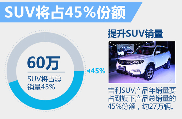 而根据吉利的设想,2016年是集团全面发力SUV市场的关键一年,多款实力车型的投放势必将带动旗下SUV业务的快速前进,该细分领域的销量预计将增长至全年60万辆目标的45%,即27万辆左右。届时吉利汽车的产品结构和销量分布将更加合理,对于其整体业绩都大有裨益。(网通社2016年4月11日北京报道)