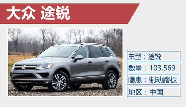 | 大众 | 途锐 | 103,569 | 2010年1月12日至2016年1月19日 | 踏板部件问题 | |