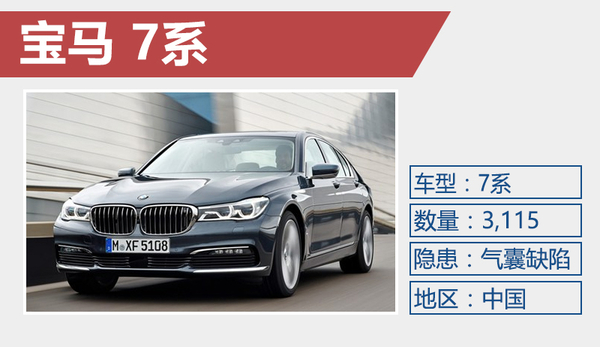 | 宝马 | 7系 | 3,115 | 2015年6月24日至12月11日 | 安全气囊缺陷 |