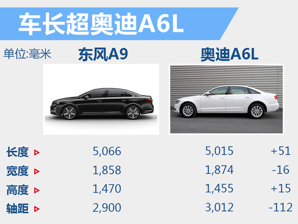 根据东风乘用车官方公布的数据,东风A9车身长、宽、高分别为5,066*1,858*1,470毫米,轴距达到2,900毫米。与定位于豪华中大型轿车细分市场的奥迪A6L相比,东风A9虽然轴距存在一定差距,但车身宽度和高度均十分接近A6L,车身长度更是比A6L长出51毫米。另外,对于处于同一细分市场的车型而言,目前国内的自主品牌车型当中,红旗H7、绅宝D80都是定位于中大型轿车市场的产品,与东风A9同级。与两个竞争对手相比,东风A9的车身尺寸与红旗H7十分接近,但两者的车身长度和轴距均远超过了绅宝D80。