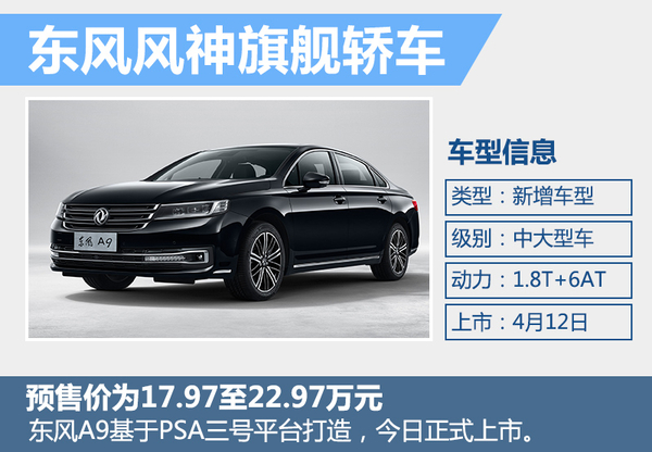 字母A取自希腊语风神“AEOLUS”的首字母,9是最大的个位数字,二者相结合组成了东风乘用车公司的全新旗舰车型。这款中大型轿车源自东风乘用车公司在2015年发布的东风1号概念车,基于PSA集团的3号平台打造。今年2月,东风A9在武汉正式发布并公布预售价格,新车将推出3款车型,预售价格在17.97到22.97万元之间。