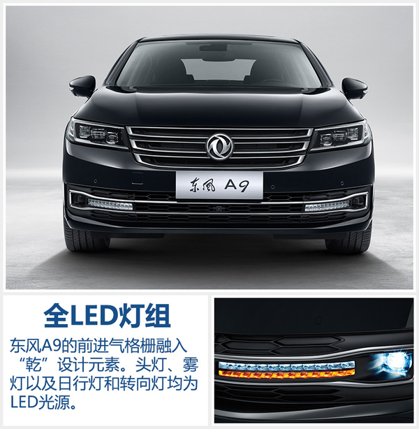 东风A9的前脸运用了大量的横幅式直线条,起到了拉伸视觉效果的作用。“乾”元素被融入到车头的设计风格中,三个倒伏的字母“D”形成了前进气格栅。前灯组为全LED光源,包含了自适应LED远光灯、LED近光灯以及弯道转向补光灯。一体式下进气格栅以回”型镀铬装饰,两端包裹着LED日间行车灯、转向灯以及雾灯。