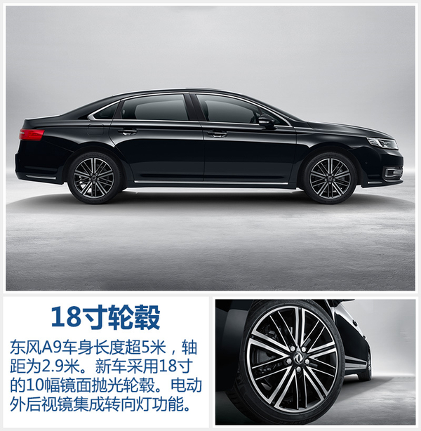 车身侧面笔直的腰线贯穿东风A9整个车身,车窗外檐以及门框下沿均以镀铬条装饰。新车全系标配18寸十辐式轮毂和米其林Primacy 3St浩悦轮胎,轮毂表面采用镜面抛光工艺,缝隙处被熏黑处理。新车的外后视镜上,集成了外侧转向灯、迎宾灯和360度全景摄像头。此外,东风A9采用增强型麦弗逊式前独立悬架系统,以及分离式多连杆式后独立悬架系统。