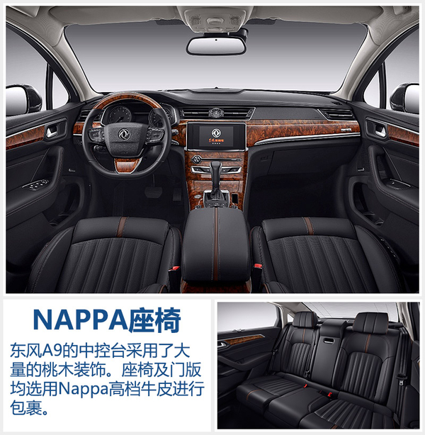 内饰部分,东风A9内饰大面积采用桃木饰装饰,整体风格更偏于商务。新车的座椅以及门板内侧均采用了Nappa高档牛皮,中控台、中央扶手和平底方向盘同样是真皮包裹。中控屏采用了钢琴烤漆面板,空调出风口等细节处使用了大量的亚光镀铬装饰。中控屏上方位置安装有指针式的石英钟,后车窗配备有电动遮阳帘。东风A9对后排座椅上方的顶棚进行了挖空挑高处理,进一步增加后排乘客头部空间。