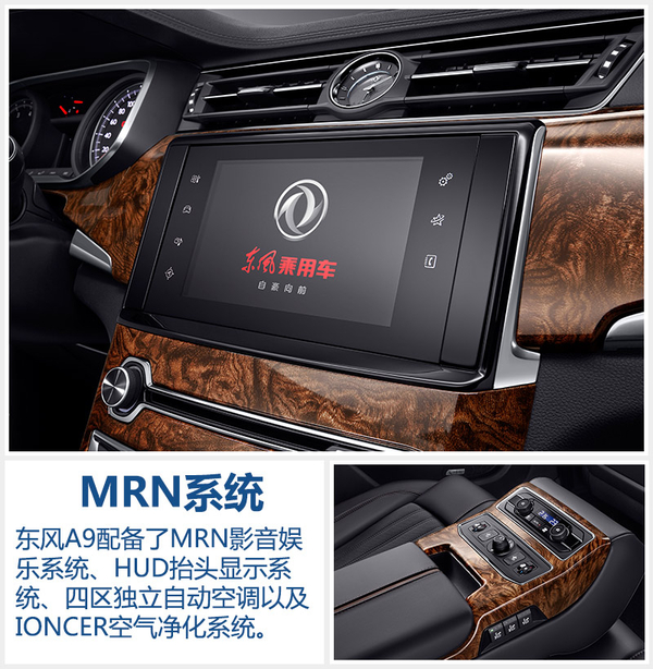 东风A9的大尺寸彩色触摸屏幕拥有MRN影音娱乐系统,可以进行空调控制、双星导航、网络互联、影音播放、信息读取,更是加入了时下流行的车载Wi-fi热点功能。高保真Hi-Fi音响和Infinity Logic 7环绕声音响系统,提供更好的视听享受。新车还拥有HUD抬头显示系统和四温区自动空调,前排座椅具有通风、加热和记忆功能,后排多功能座椅更是具备10点气动按摩功能。此外,新车可以通过车头牌照下的前摄像头、尾门的后摄像头和后视镜下方的两个摄像头,实现360度环车影像。