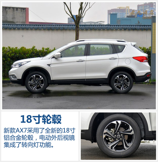 新款AX7在车身尺寸方面没有调整,外观也没有很大的变化。相比现款车型,新款AX7全系均标配18寸“旋风”铝合金轮毂以及万力轮胎,LED日间行车灯、大灯高度自动调节以及外后视镜电动调节也是标准配置。新车配备了大尺寸电动天窗配置,前大灯远近光均为卤素光源,并配备了前雾灯。而外后视镜电加热除霜以及外后视镜电动折叠两项配置则只在高配车型中搭载。新车的尾灯依然采用全LED光源,同时配备倒车影像和4探头泊车辅助雷达。同时,新款AX7还配备了无钥匙进入系统以及一键启动功能,多功能钥匙还可以升降车窗。
