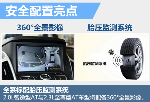 新款AX7在安全配置中同样新增了多项配置,全系车型标配胎压监测系统与HSA坡道辅助系统。三款智悦车型增加了智能倒车影像配置,2.0L智逸型AT则升级为360°全景影像。另外,2.0L智逸MT车型在气囊数量方面有所增加,相比现款车型多了前排侧安全气帘与前后排一体式安全气帘。(网通社2016年4月12日北京报道)